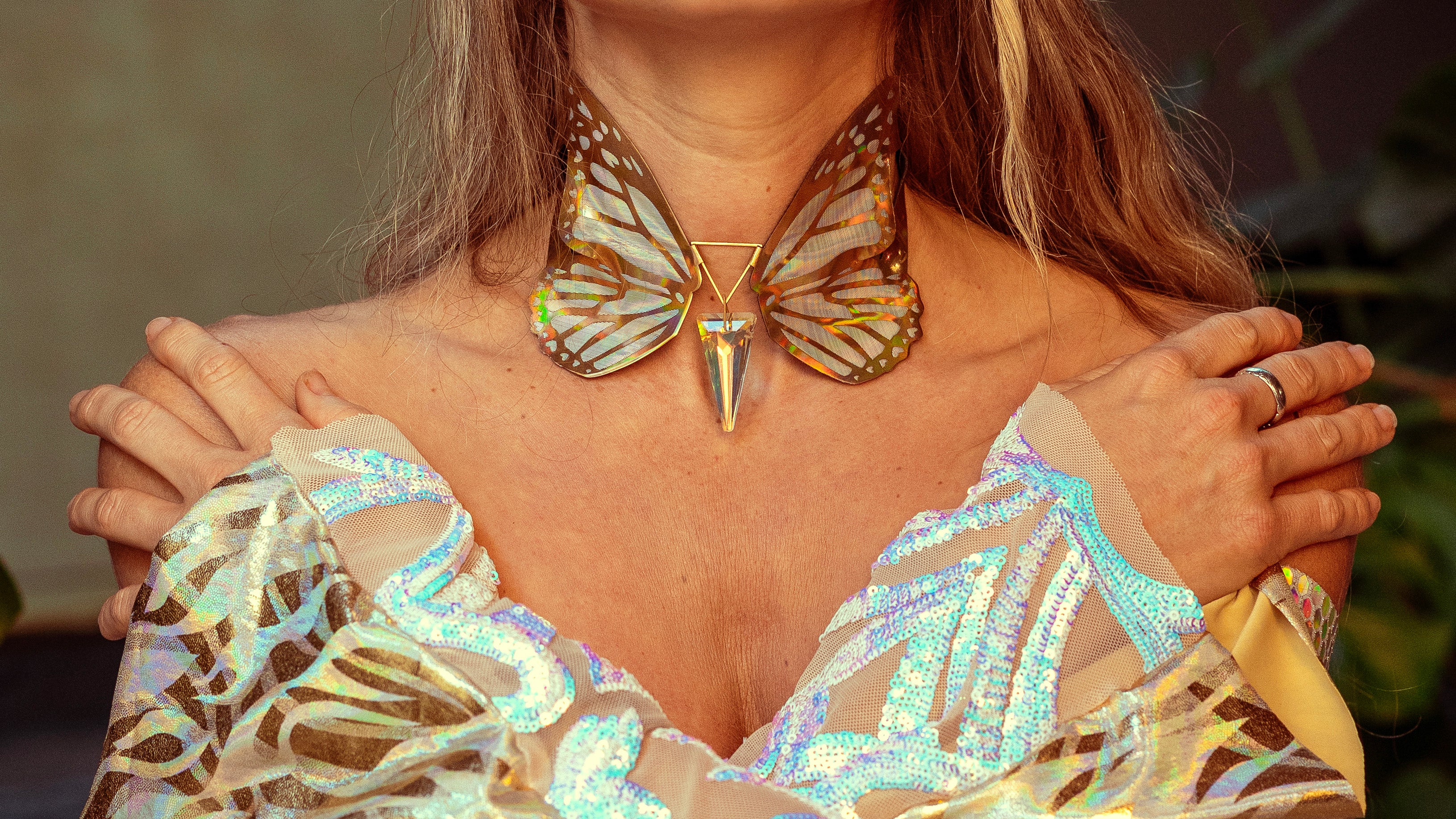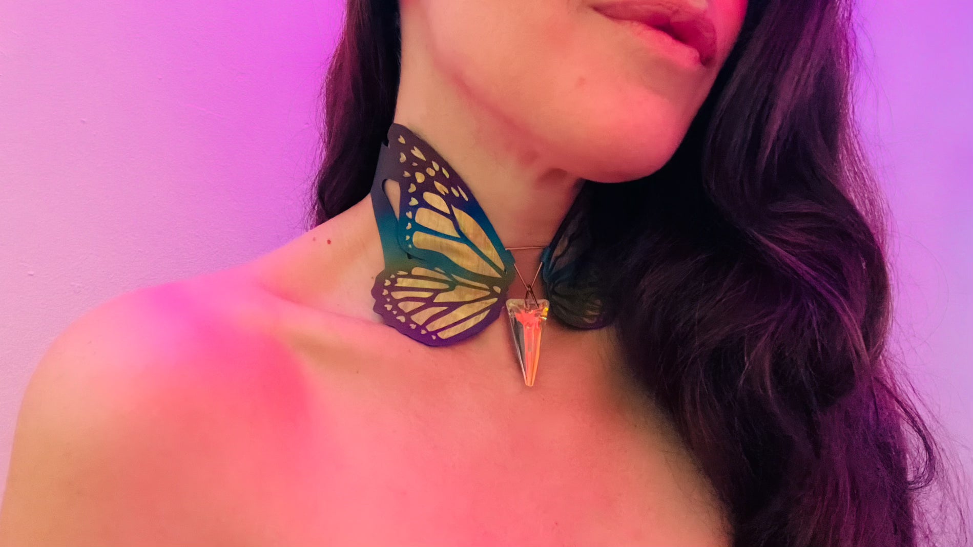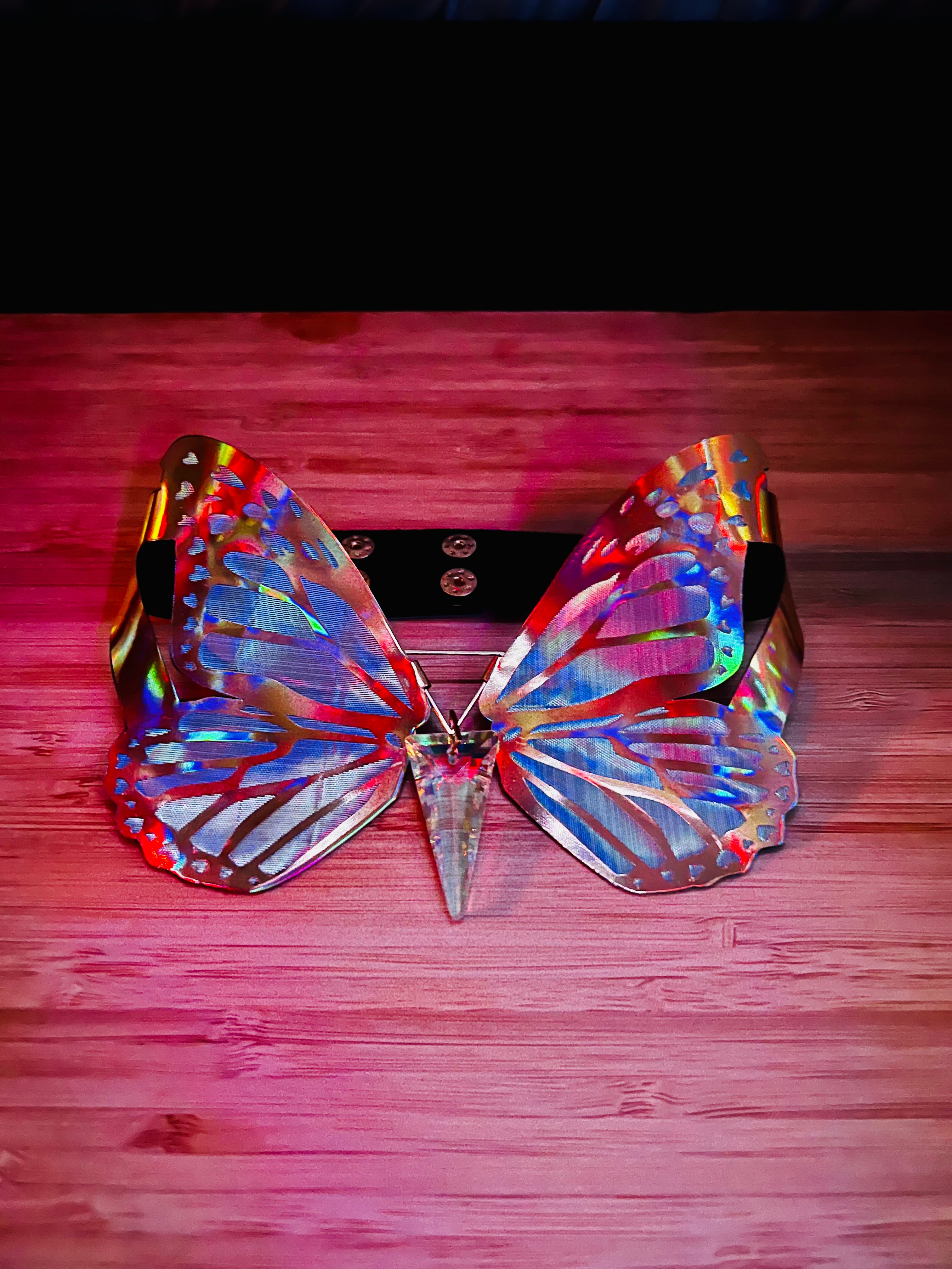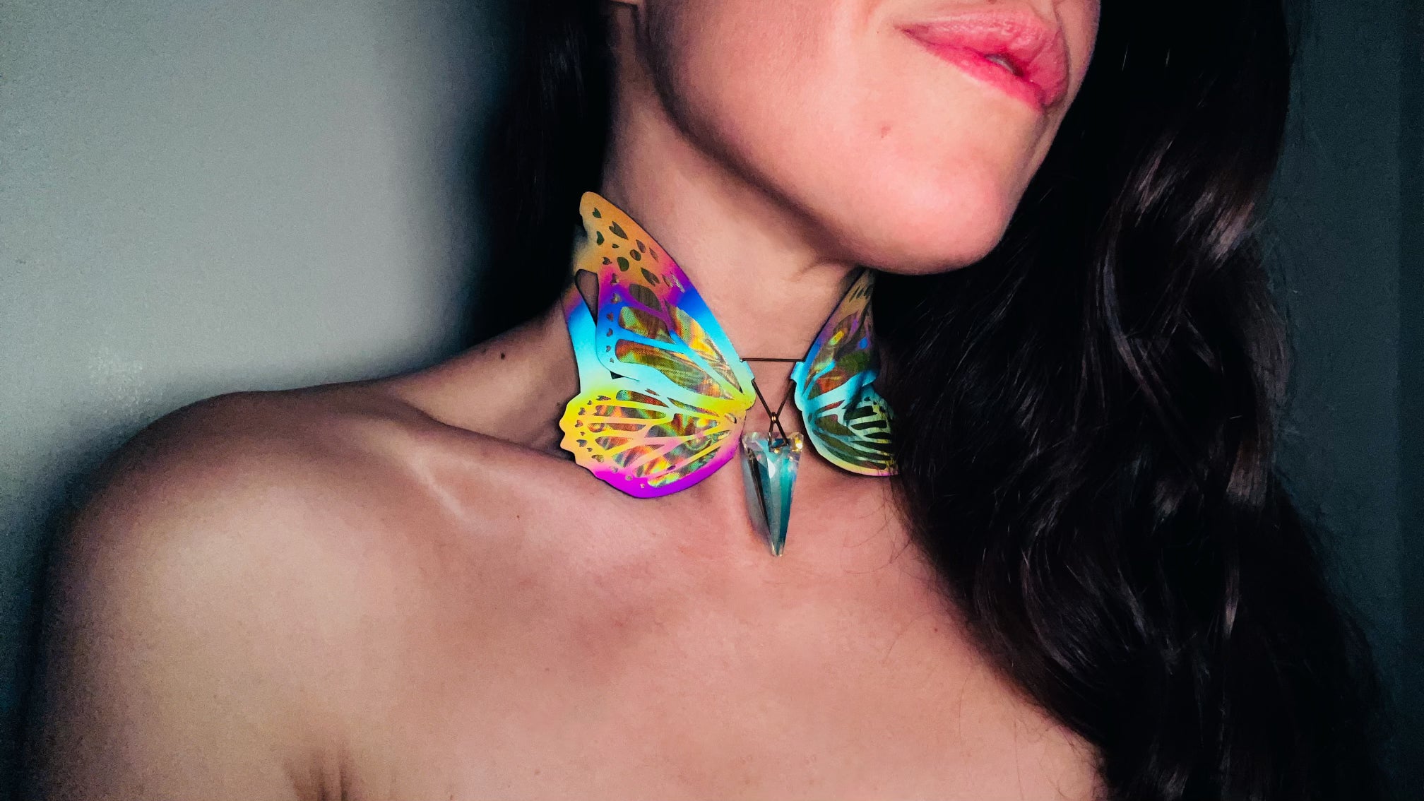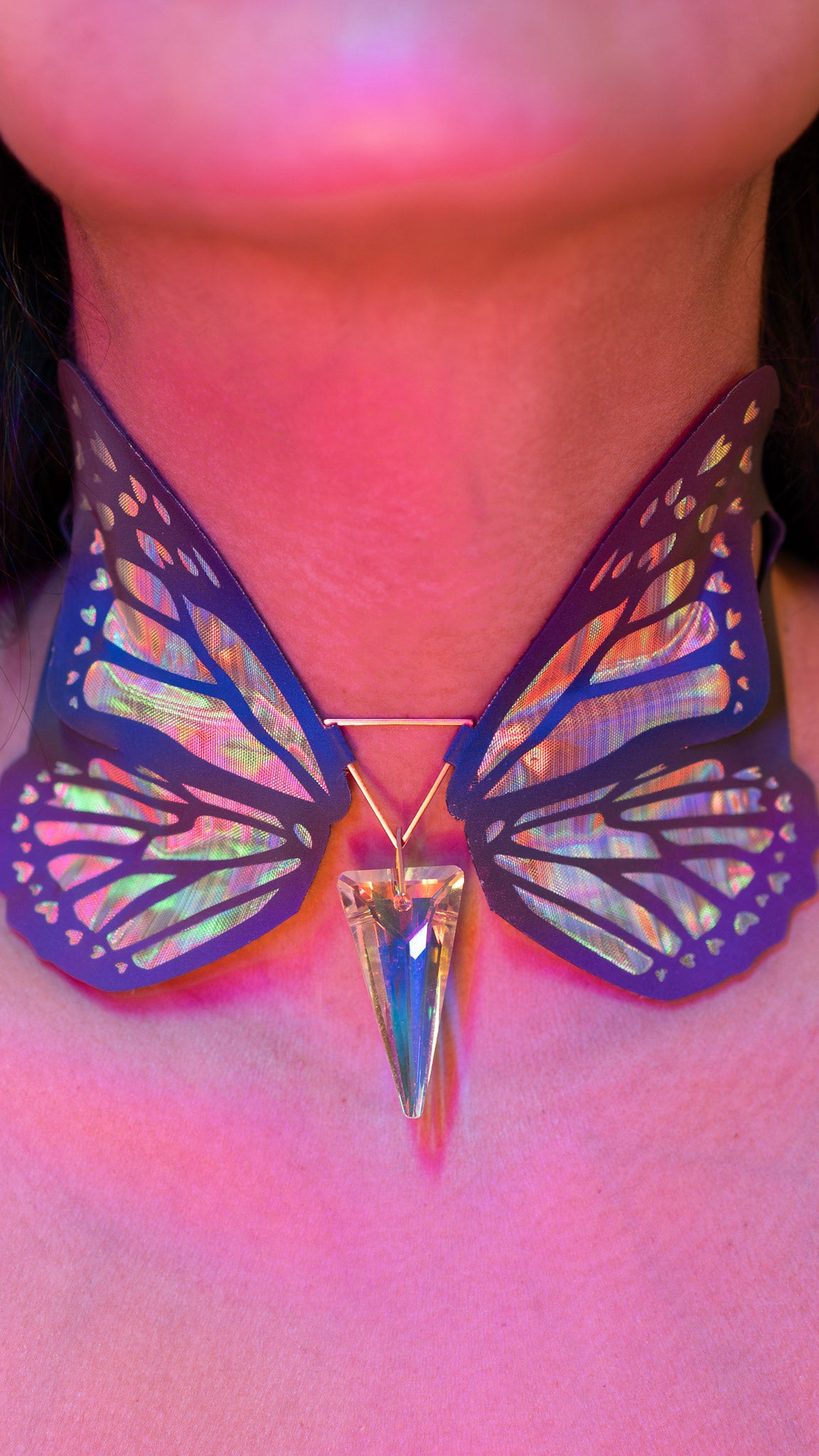 The most comfortable choker you will ever wear! The inner layer of the butterfly wing is made from a holographic mesh that allows air to flow freely across your skin. The flexible materials will conform to the shape of your neck, and the soft backing keeps it from sticking to you.