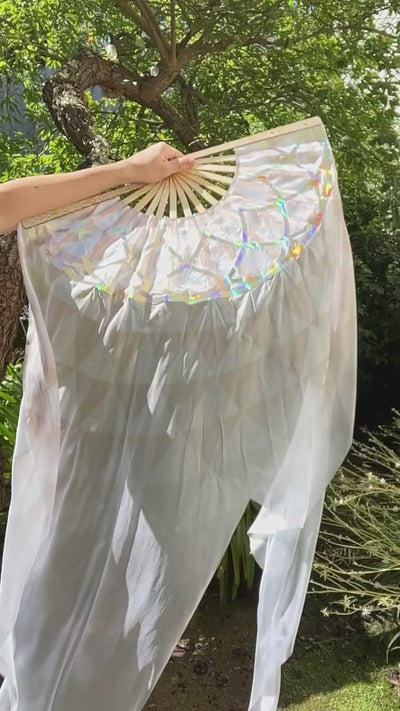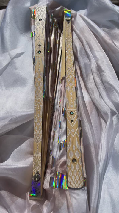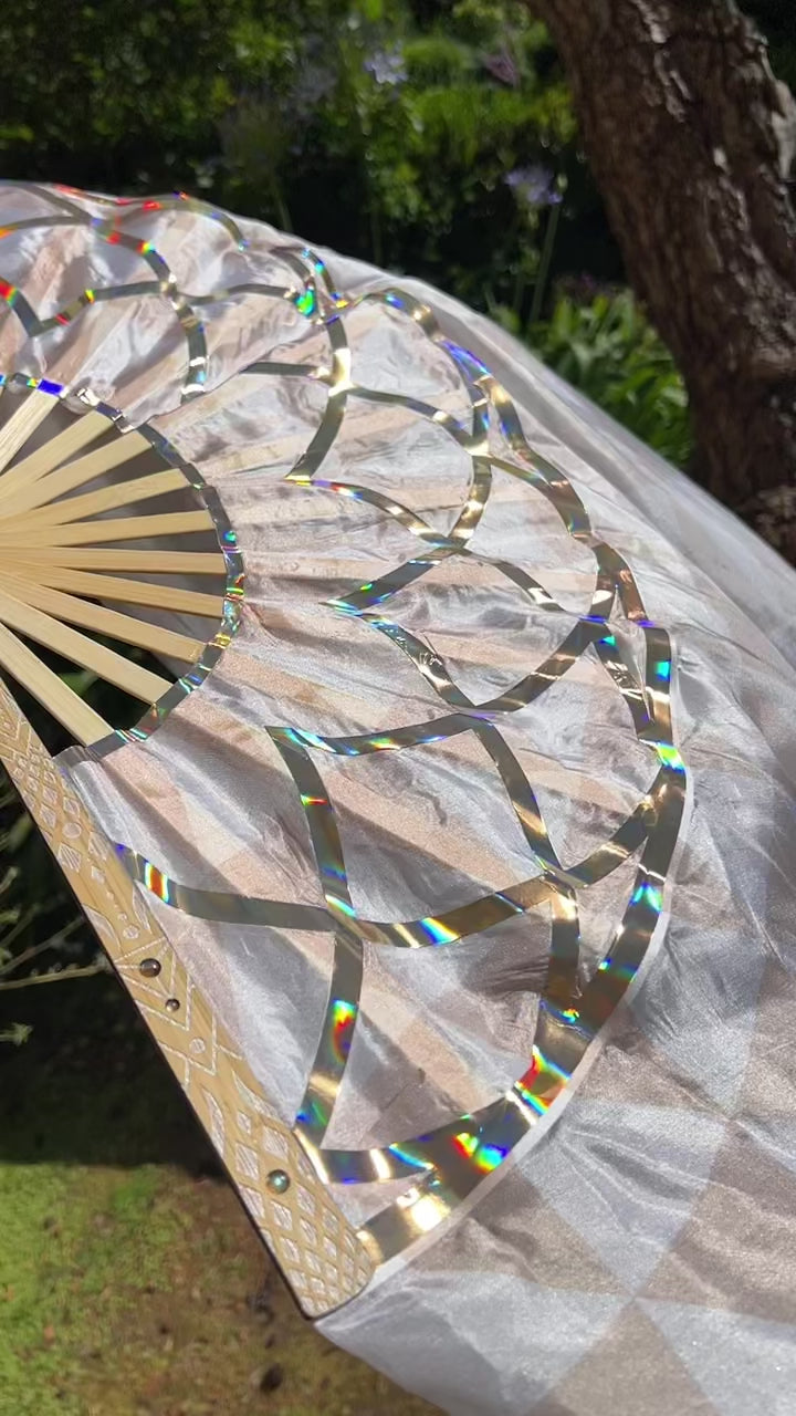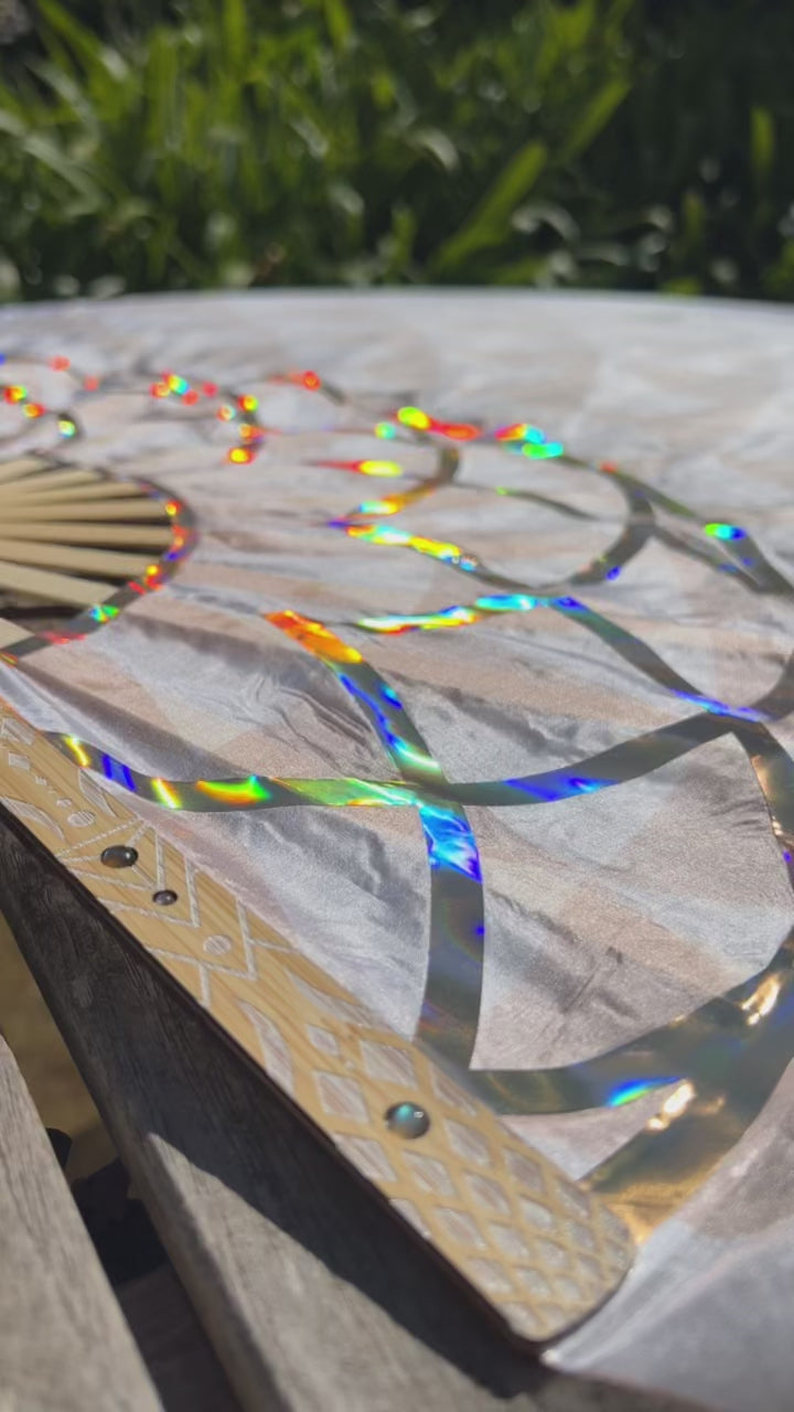 - Lux Holographic Overlay & Crystal Staves Set (single fan weight = 5.4oz) - A unique look, weight and feel with durable materials that catch light and bring a little extra magic to your flow. Double sided holographic overlays cover the fan blades, and the bamboo engraved end staves have inlaid crystals. This set has thicker center staves to support the overlays, and a short break-in period until the folds settle = slightly slower opening and closing speed at first.