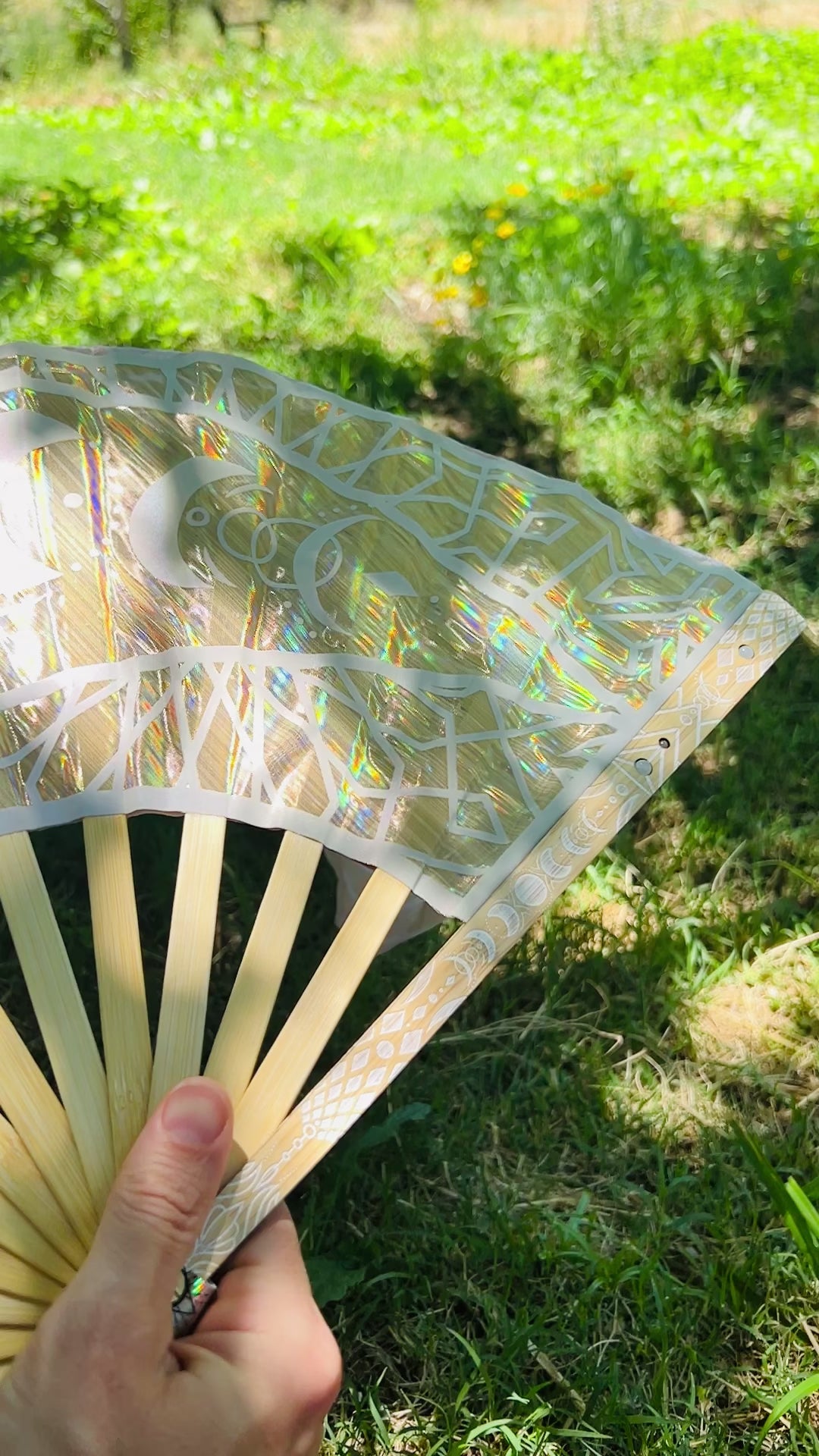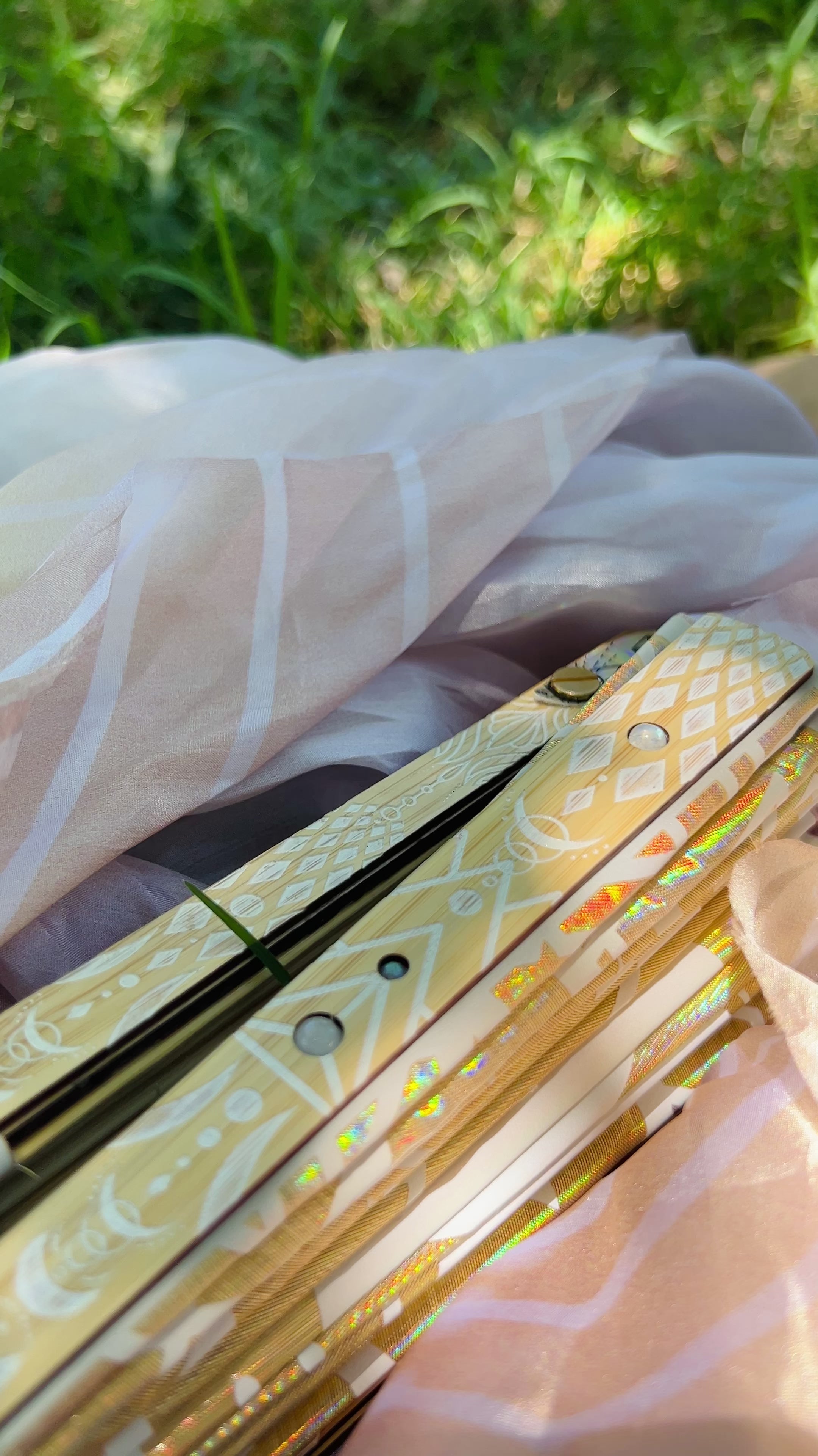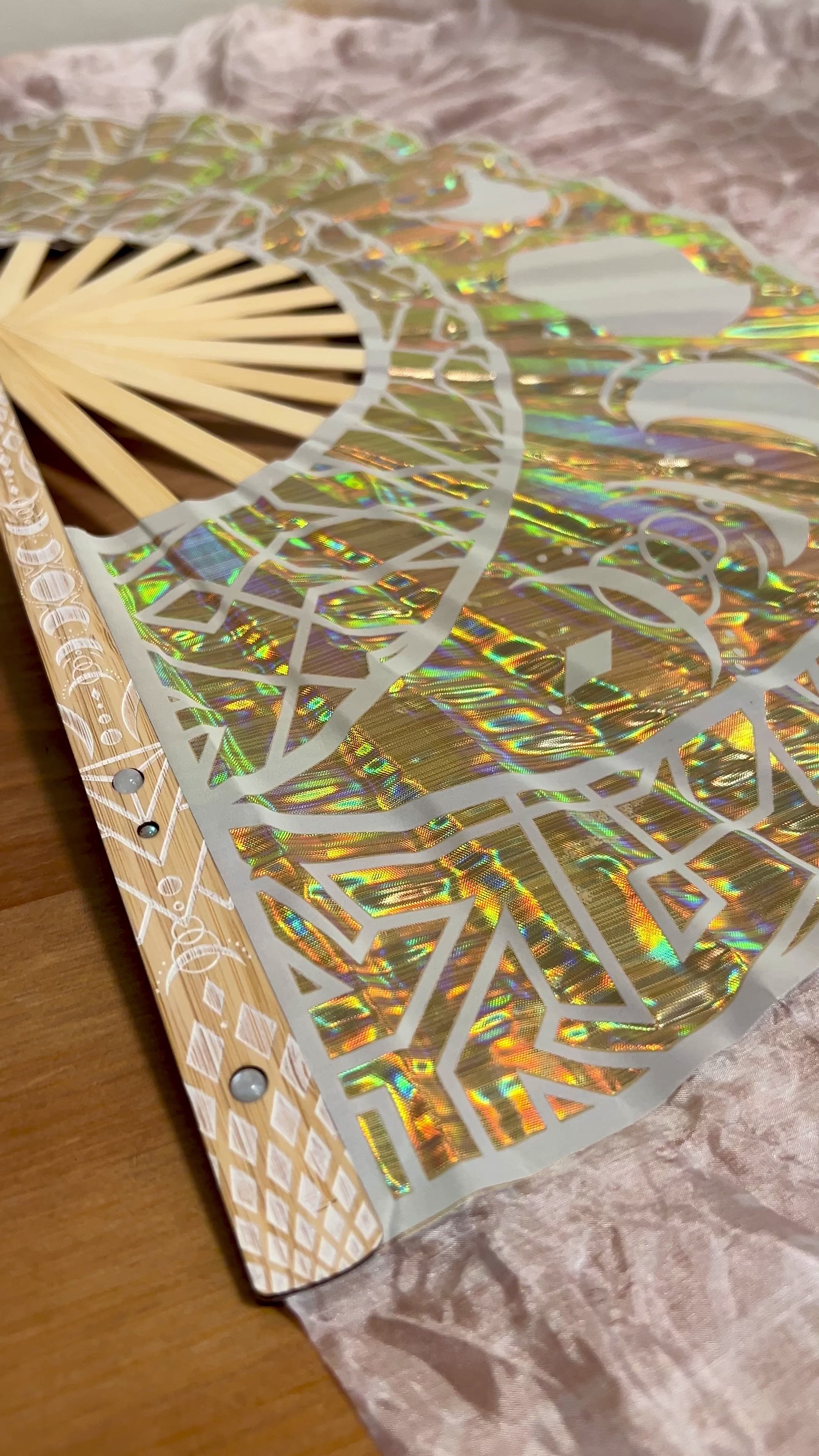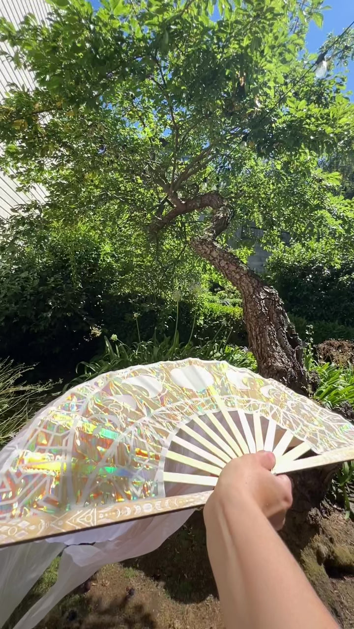 - Lux Holographic Overlay & Crystal Staves Set (single fan weight = 5.4oz) - A unique look, weight and feel with durable materials that catch light and bring a little extra magic to your flow. Double sided holographic overlays cover the fan blades, and the gold and bamboo engraved end staves have inlaid crystals. This set has thicker center staves to support the overlays, and a short break-in period until the folds settle = slightly slower opening and closing speed at first.